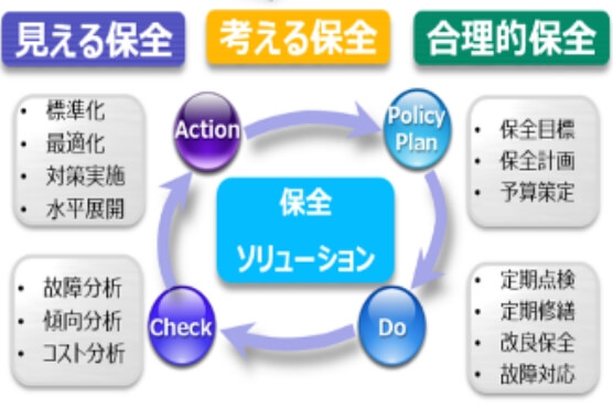 保全の標準化と技術技能伝承を支援し、設備の安定稼働とライフサイクルコストのミニマム化を支援する保全ソリューションの仕組みをご提案します。製造設備・装置、ユーティリティ施設を総合的に管理し、合理的な計画保全、定量的保全をご提供します。
