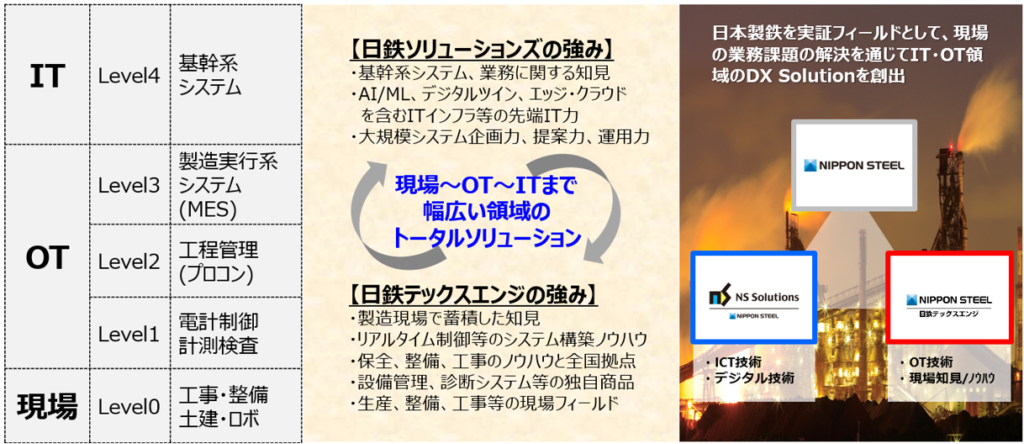 日鉄ソリューションズ株式会社(本社:東京都港区、代表取締役社長:玉置 和彦、以下「NSSOL」)と、日鉄テックスエンジ株式会社(本社:東京都千代田区、代表取締役社長:小野山 修平、以下「日鉄テックスエンジ」)は、デジタル製造業領域での業務提携に関する基本合意書を2023年12月20日に締結したことを受け、このたび、それぞれの有するIT・OT領域でのソリューションと技術知見を融合させ、統合ソリューションの共同開発を進めることに合意しました。