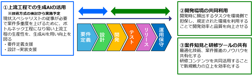 これまで、両社が有する数理モデルの技術を用いて、配船・原料調合・製造・置場・物流・整備・修理などの各業務領域において多数の最適化プロジェクトを実行してきましたが、多様化する顧客企業の最適化ニーズに対してより一層充実した対応の実現を目指し、両社が有するアセットのプール化を通じて案件対応力を強化していきます。具体的には、①上流工程での生成AIの活用、②開発環境の共同利用、③案件知見とSE研修ツールの共有により、各社戦力の拡充と共通化を行うものとなります。