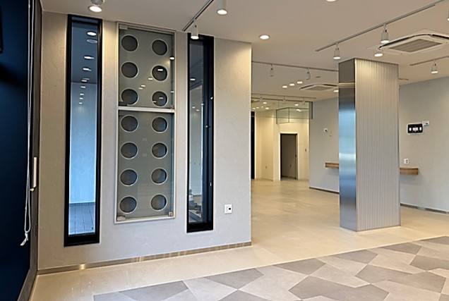 1階部分はショールーム化し、NSスーパーフレーム工法®の構造壁が見えるようスケルトン壁を設けています。